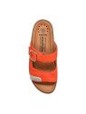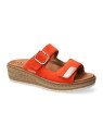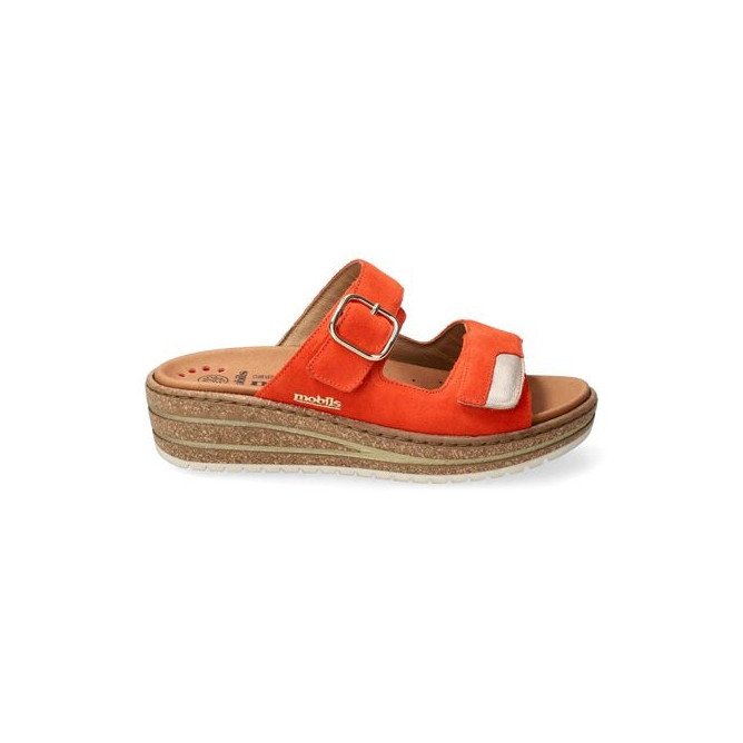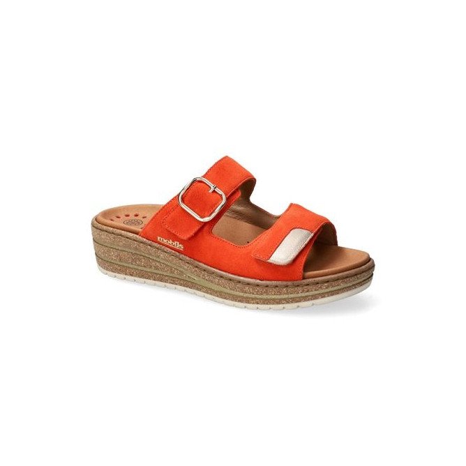 La mule Randya Tangerine se définit par son chaussant généreux et sa grande praticité. Sa tige est composée de deux larges brides réglables par velcro, permettant d'ajuster parfaitement la chaussure à la largeur de votre pied. La bride supérieure est ornée d'une élégante boucle métallique décorative qui souligne son design soigné. Elle repose sur une semelle compensée légère à l'aspect liège, offrant une cambrure confortable pour la marche. Fidèle aux spécificités de la gamme Mobils, elle bénéficie d'un matelassage intégral et de la technologie Soft-Air pour protéger vos articulations. Un atout majeur pour ce type de modèle : la semelle intérieure est amovible, vous permettant d'y loger facilement vos propres semelles correctrices.