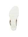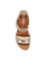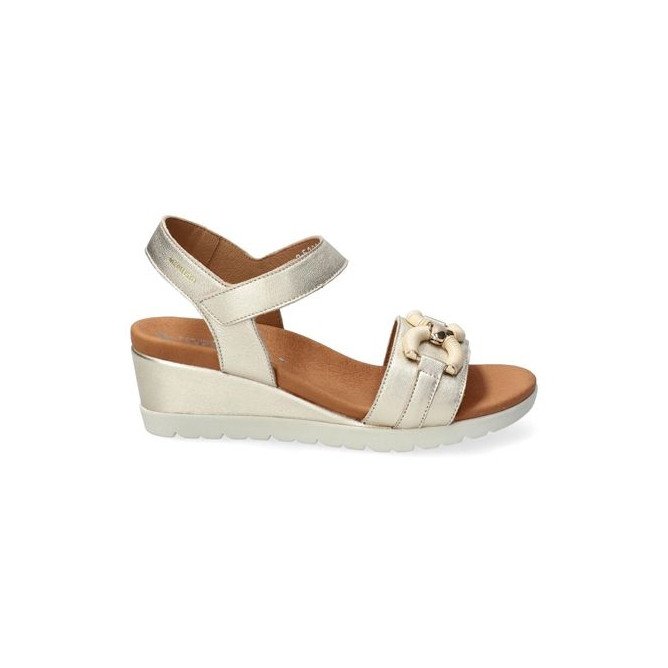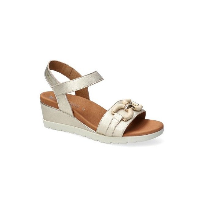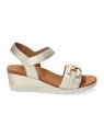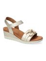 La sandale Youna Platinum se distingue par son allure luxueuse et sa silhouette féminine. Sa tige en cuir de première qualité arbore une bride avant travaillée, ornée d'un élément décoratif en forme de maillons bicolores (ivoire et métal), apportant une touche de sophistication moderne. Pour un maintien irréprochable, elle dispose d'une bride de cheville réglable par velcro, permettant un ajustement personnalisé et une mise en place rapide. Elle repose sur une semelle compensée stable avec une doublure intérieure en cuir pour un accueil moelleux du pied. La semelle extérieure blanche, dotée de la technologie Soft-Air intégrée, assure une absorption maximale des chocs pour protéger vos articulations et votre dos, vous garantissant une marche sans effort du matin jusqu'au soir.