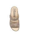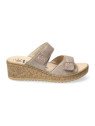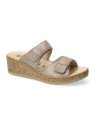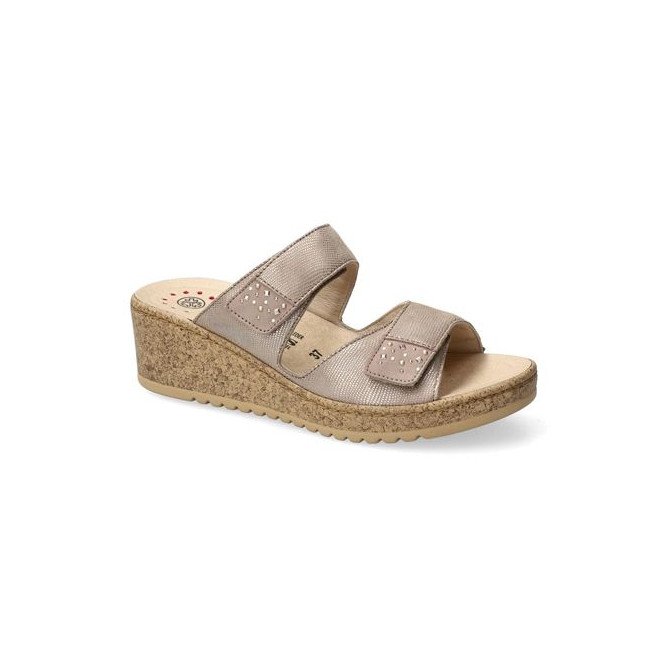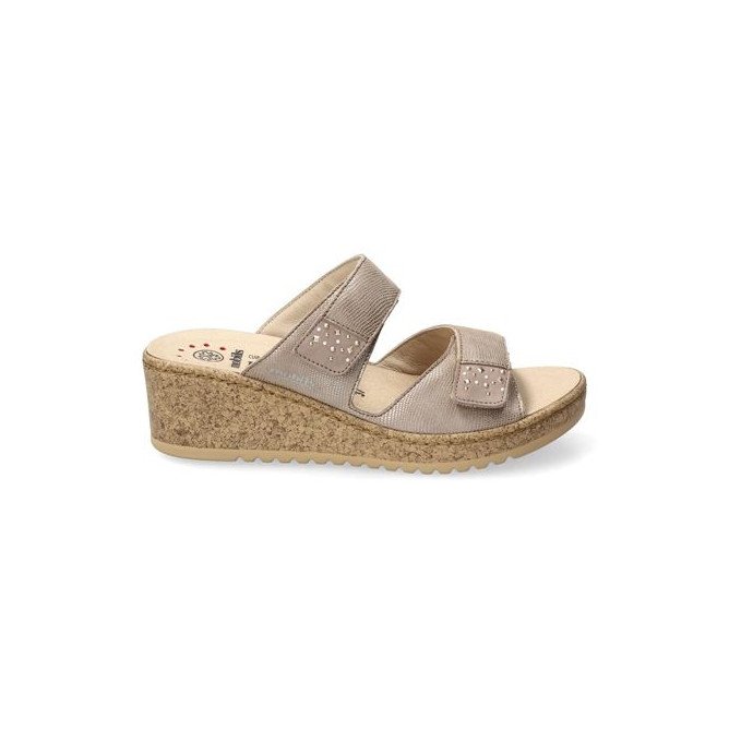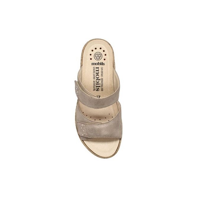 La mule Navina Light Taupe se distingue par son design équilibré et son chaussant généreux. Sa tige en cuir de haute qualité est structurée par deux larges brides horizontales, chacune décorée d'un élégant motif de strass scintillants qui apportent une touche de lumière à chaque pas. Ces deux brides intègrent des fermetures par velcro, permettant un ajustement personnalisé et précis à la largeur de votre pied pour un maintien optimal sans points de pression. Fidèle aux standards Mobils, elle bénéficie d'un matelassage intégral et d'une semelle intérieure amovible anatomique, parfaite pour l'usage de semelles orthopédiques. Elle repose sur une semelle compensée à l'aspect liège, alliant légèreté visuelle et stabilité, tout en intégrant la technologie Soft-Air pour absorber les chocs et préserver vos articulations.