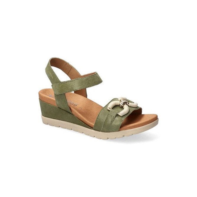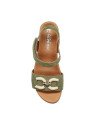 La sandale Youna Khaki se distingue par son élégance décontractée et ses finitions de haute qualité. Sa tige en nubuck vert kaki dispose d'une large bride sur le devant, ornée d'un accessoire en forme de maillon entrelacé aux tons crème et métallisés qui illumine le modèle. Elle est équipée d'une bride de cheville ajustable par velcro, garantissant un maintien personnalisé et une grande facilité d'enfilage. Elle repose sur une semelle compensée beige clair à la cambrure douce, idéale pour allonger la silhouette tout en restant stable. Intégrant la technologie Soft-Air, la semelle intérieure absorbe les chocs à chaque pas pour protéger vos articulations et assurer un confort durable, même lors d'une utilisation prolongée.