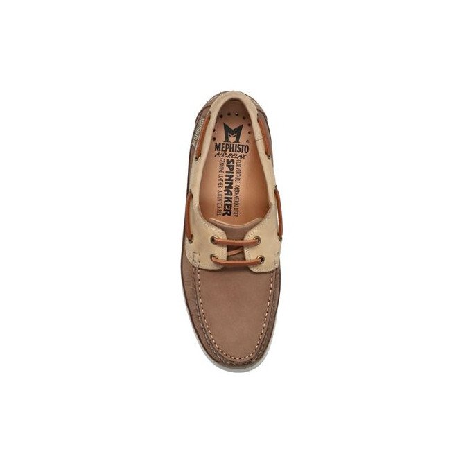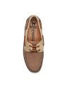 Le modèle Boating Taupe se distingue par sa construction authentique et ses matériaux de première qualité. Sa tige bicolore marie un cuir nubuck marron chaud sur la partie principale à des empiècements beiges sable sur les quartiers et le pourtour de la cheville. Elle respecte les codes traditionnels de la chaussure bateau avec son laçage en cuir traversant 360° et ses surpiqûres contrastées faites main sur le plateau avant. Le système de fermeture à deux œillets avec lacets en cuir marron assure un maintien personnalisé. Elle repose sur une semelle cupsole blanche épurée, souple et antidérapante, qui intègre la technologie Soft-Air. Ce dispositif absorbe les chocs à chaque pas, garantissant une marche sans fatigue et une protection optimale des articulations.